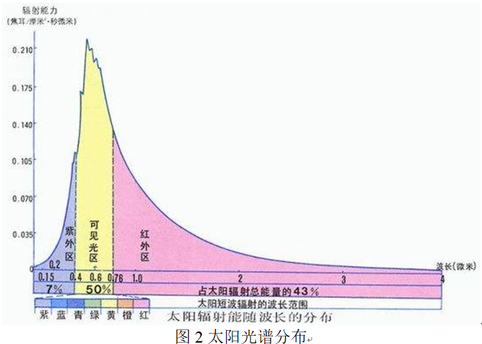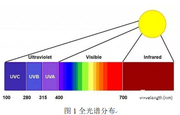 全光譜包含紫外光、可見(jiàn)光和紅外光,不同光譜分布的能量不同,各種波長(cháng)的成分比例不同,約99.9%的能量都集中在紫外區、可見(jiàn)光區和紅外區。